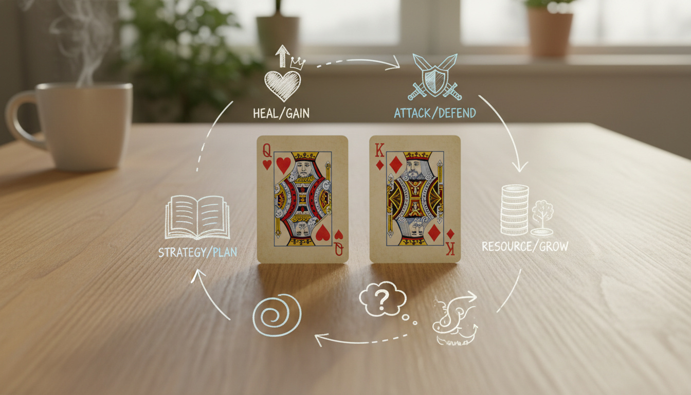 • Oppsett: Kortene blandes og deles ut før spillet starter